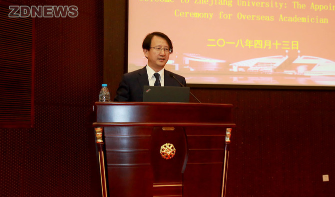 校長吳朝暉致辭,并為Michael Levitt佩戴浙江大學?;?。副校長張宏建出席聘任儀式。