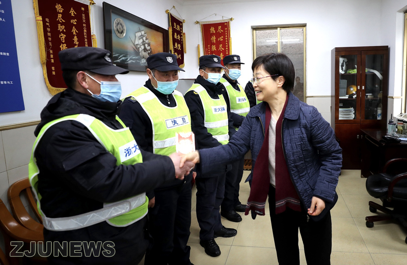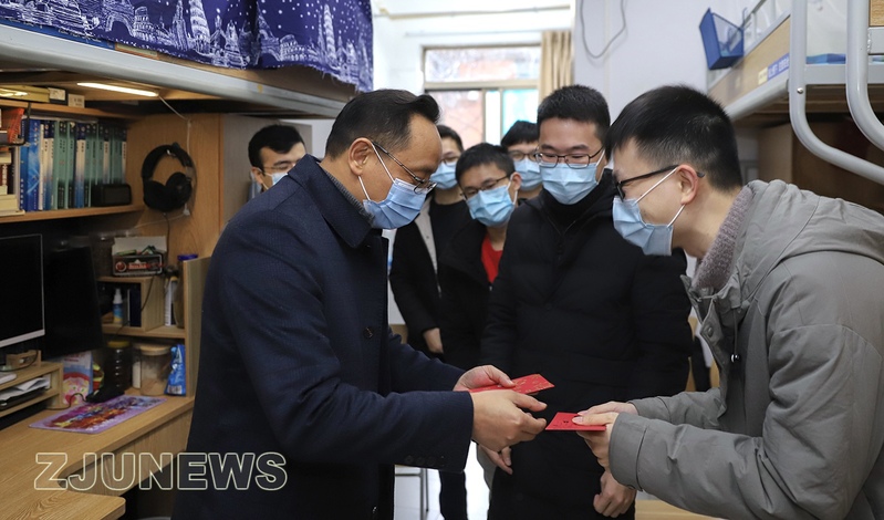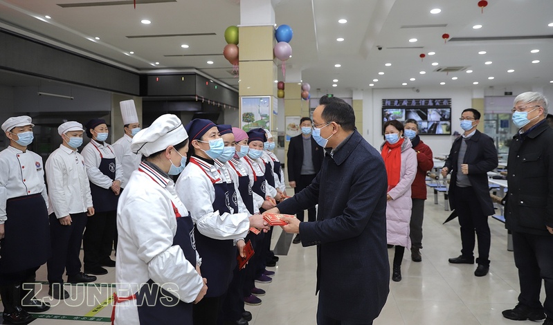 校領(lǐng)導(dǎo)與留校學(xué)生座談交流,并走訪慰問食堂、校醫(yī)院、安保辦、水電中心、圖書館、實驗室及求是派出所等單位值班人員,向大家送上拜年紅包。吳朝暉祝大家新春快樂、萬事如意,并表示,浙大是每一個求是人的大家園,希望同學(xué)們利用春節(jié)留校寶貴時間,學(xué)習(xí)、生活齊奮進。各有關(guān)部門要做好大家就地過年服務(wù)保障,落實疫情防控工作,確保度過一個歡樂祥和的春節(jié)。